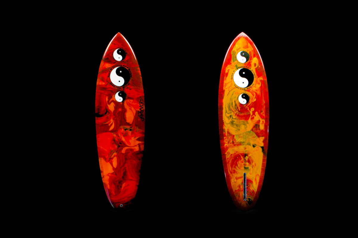 In Heat 1, Heritage’s Brian Wynn and his unique spiral design took the win over Brian King’s moodier palate of smokey, dark reds. Heat 2 was a close race between two totally different approaches, with Mark Petrocelli of Faktion/Pilgrim pouring a modernist look just beating out HIC’s Jasper Heyne, who came in hot with a swoopy lava flow design. In Heat 3, another close one, Son of Cobra, teaming up with Lost/Catalyst, and his sunset-colored design took out Dustin Bernard and Surf Ride’s clean, punkish, pink-and-black stunner. Finally, voters in Heat 4 gave the nod to WRV’s Austin Walker and his tropical, ocean-vibed board over Mike Hurrin and Hansen’s resin swirl/rain band combo.