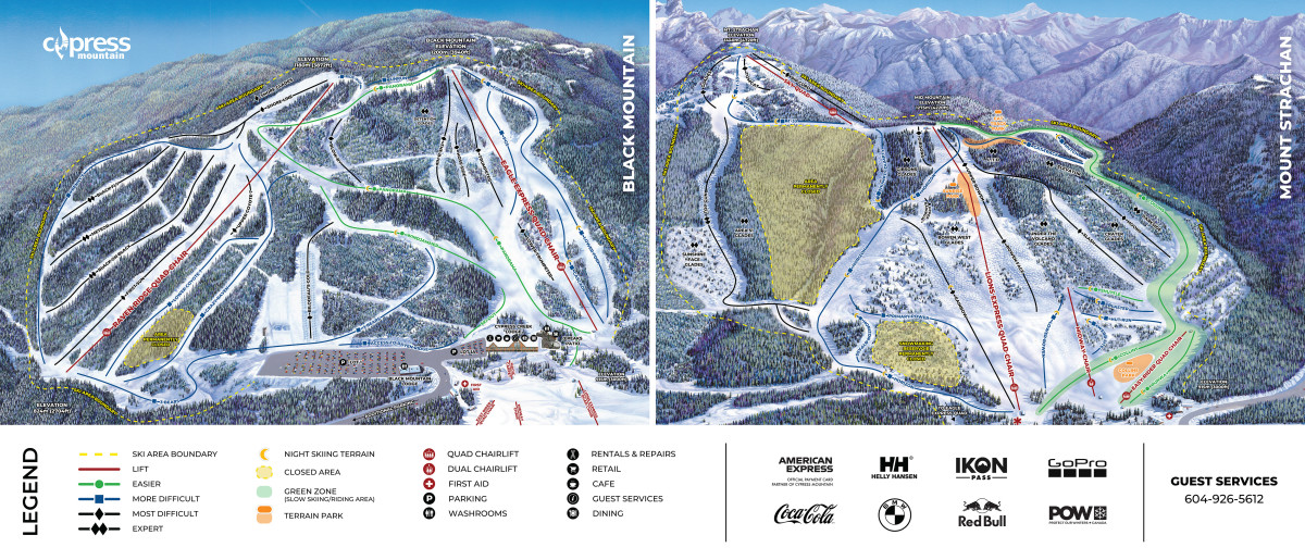 Cypress Mountain Resort is actually two ski areas in one- Black Mountain (left) and Mount Strachan (right). The Collins run can be seen on the far look’s right of the Mount Strachan map.