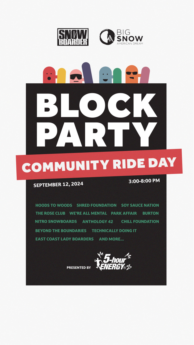 On September 12, 2024, East Coast community organizations, groups, and crews will come together at Big SNOW in East Rutherford, New Jersey for a super community ride day, the SNOWBOARDER x Big SNOW Block Party presented by 5 Hour Energy.