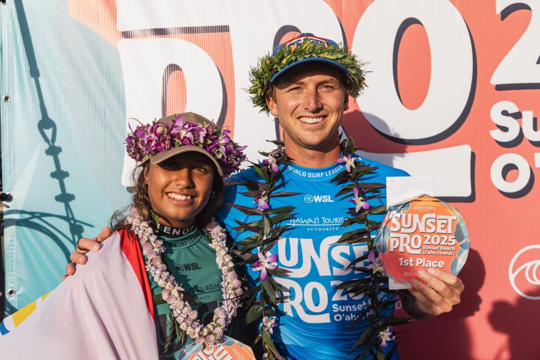 SUNSET BEACH, Oahu, Hawaii (Saturday, November 22, 2025) – Today, Kiara Goold (PYF) and Finn McGill (HAW) claimed iconic wins at the HTA Sunset Pro, a men’s and women’s World Surf League (WSL) Qualifying Series (QS) 2,000-level event, in pumping conditions at Sunset Point. Eight-to-twelve-foot wave faces pulsed into the legendary lineup with Goold, 15, overpowering Sunset’s energy for her maiden QS win alongside McGill’s precision and power leading to a second-career QS victory.